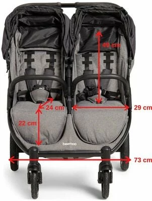 Beemoo BFF60 er en fleksibel søskenvogn med flere praktiske funksjoner. Vognen er lett å kjøre på alle slags underlag.Setet er mykt polstret og er utstyrt med en justerbar fempunktssele, samt en frontbøyle som kan åpnes. Seteryggen kan enkelt justeres til ønsket posisjon med kun én hånd, og den justerbare fotstøtten gir god støtte til barnets bein. Den store kalesjen kan trekkes ut i tre trinn, og beskytter mot sol og regn. Kalesjen har også ventilasjonspaneler i nettingtøy, som holder vognen kjølig på varme dager, eller fungerer som et kikkhull når du vil se barnet ditt.Når vognen ikke er i bruk, foldes den enkelt sammen for enkel oppbevaring.- 22 kg / sete.- Romslig varekurv under.- Lomme på seteryggen.- Justerbart håndtak (kneledd).- Fronbøyle som kan åpnes i 180°.- Justerbar fempunktssele.- Justerbar fotstøtte.- Justerbar rygg.- Kalesje med tittehull.- Detaljer i syntetskinn.Vognen er ikke kompatibel med babybilstol.